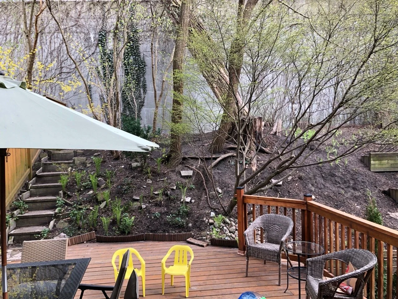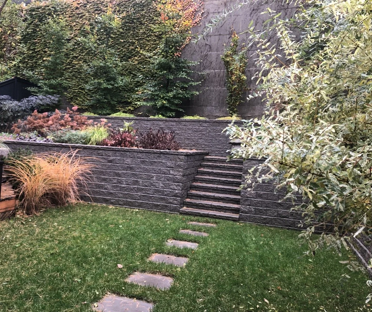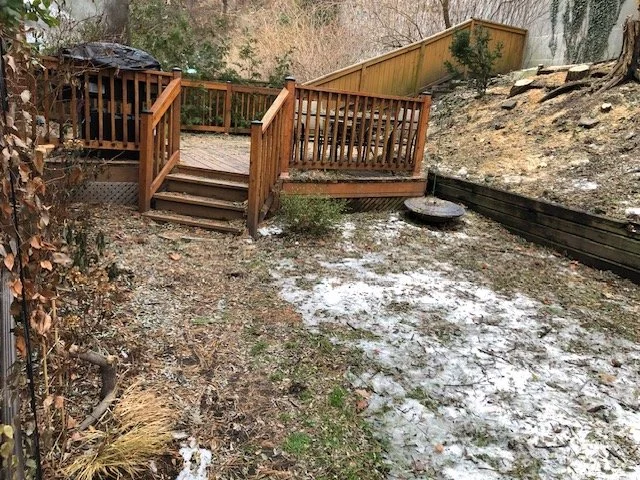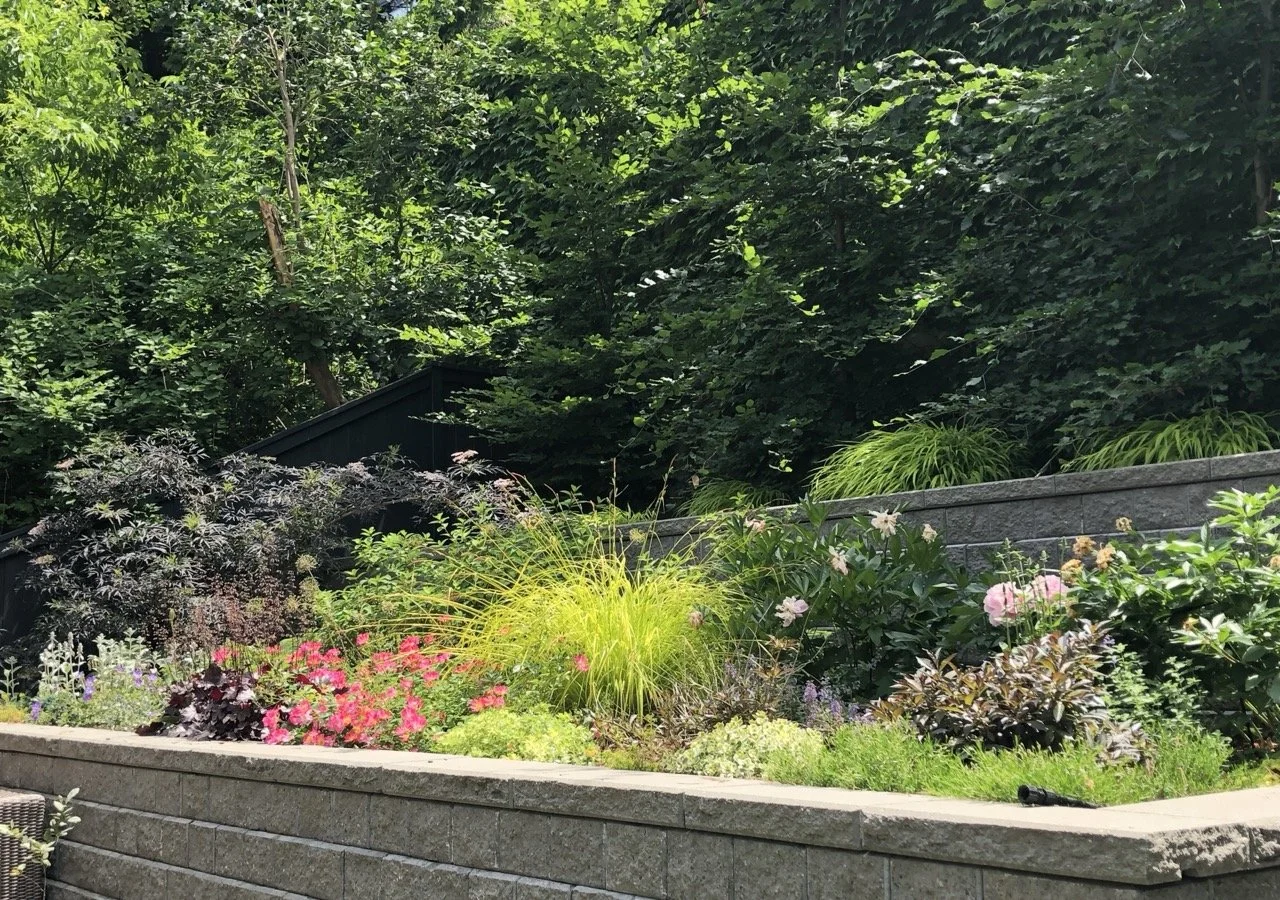 The hill in the backyard is pushed back to make more room for a recreational lawn space and a wooden deck. Two-tired retaining walls are built to create level planting beds. Planting strategically screens the view from neighbor’s second floor windows to the deck. A vegetable planter is placed against the house right underneath the clients’ kitchen window and beside the BBQ.