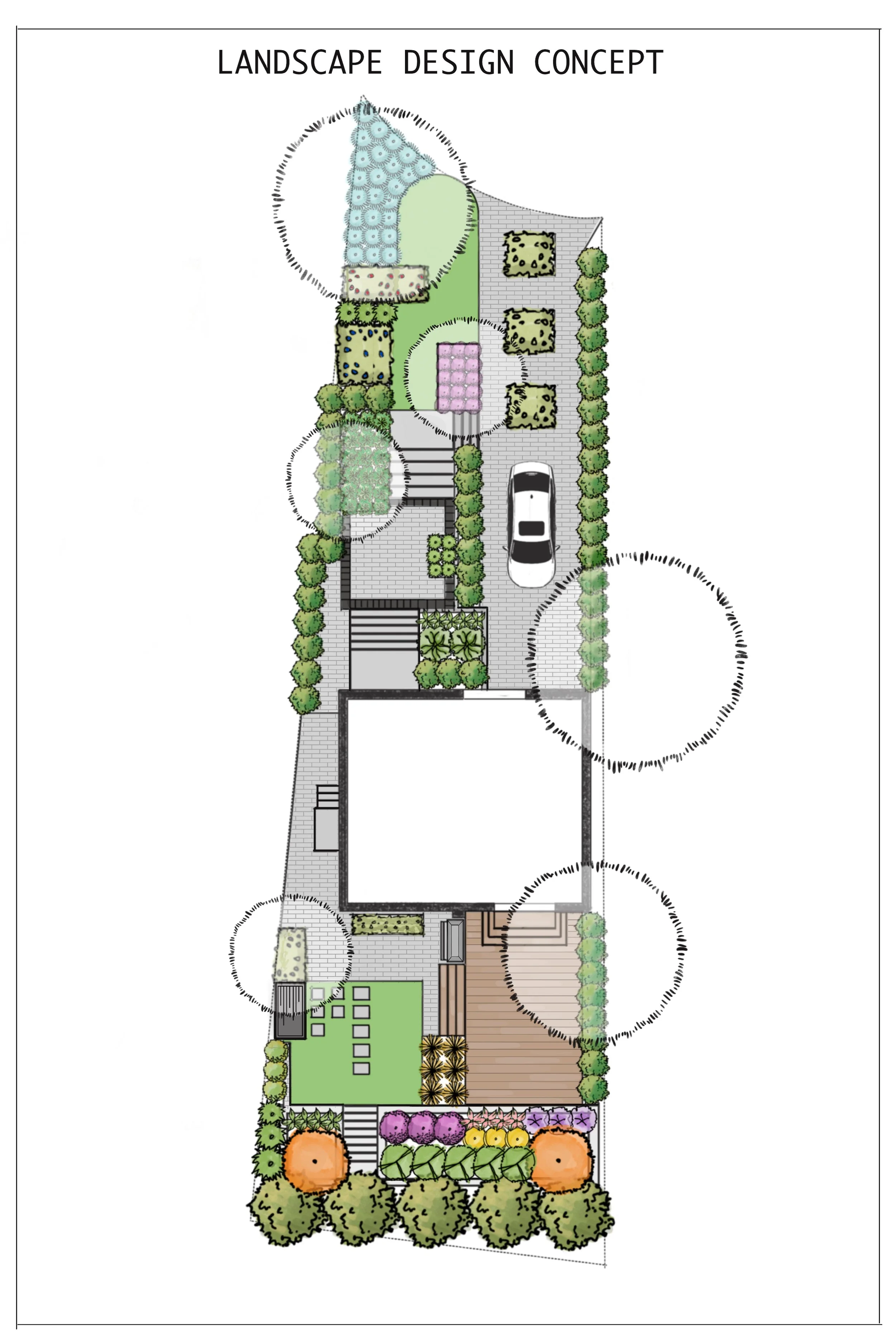 There is a series functional issues with this residential property, and the maintenance level is very high. The front yard is a monoculture lawn, and the back yard has a big hill with erosion problem and invasive species. The homeowners wanted to have more useable space in both front and back yards for lounging, entertaining and gardening. They have a clean and contemporary aesthetics.